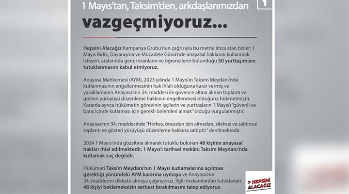 “Hepsini Alacağız Kampanya Grubu’nun çağrısıyla bu metne imza atan bizler; 1 Mayıs Birlik, Dayanışma ve Mücadele Günü’nde anayasal haklarını kullanmak isteyen, aralarında genç insanların ve öğrencilerin bulunduğu 50 yurttaşımızın tutuklanmasını kabul etmiyoruz”