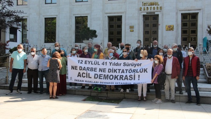 İnsan Hakları Derneği (İHD) İstanbul Şubesi, eski TRT Radyosu binası önünde açıklama yaptı. Siyasi parti ve demokratik kitle örgütü temsilcilerinin katıldığı açıklamada, “12 Eylül 41 yıldır sürüyor ne darbe ne diktatörlük acil demokrasi” pankartı taşındı. Açıklamayı yapan Şube Başkanı Gülseren Yoleri, darbe Anayasası’nın ve kurumlarının hala yürürlükte olduğunu belirterek, AKP’nin bundan faydalanarak gittikçe otoriterleştiğini söyledi. Yoleri, darbeleri önlemek için yapılması gerekenleri şu şekilde sıraladı: “Darbe kurumlarını kapatmak, hak ihlallerine neden olan yasaları tüm sonuçları ile ortadan kaldırmak, darbecileri ve darbe sürecinde işlenen suçları cezalandırmak, darbe nedeniyle doğan zararların giderilmesini de kapsayacak şekilde onarıcı adaleti sağlamak, hak ve özgürlükleri evrensel ölçülerde genişletmek ve baskıdan kurtarmak, demokratik ve özgürlükleri esas alan yeni bir anayasa yapılması, demokratikleşme yanında çatışma çözümü, pozitif barışı sağlamak ve kurumsallaştırmak.”