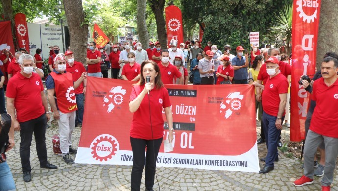 15-16 Haziran’ın sadece anılacak bir gün olmadığını belirten Çerkezoğlu, “Bugün her örgütlenmemizde işyerinde, fabrikada önümüze barajlar, yasaklar, bin bir türlü engel getiriyorlar ama nafile, DİSK yoluna devam ediyor. Bugün de işçi sınıfının kazanılmış bütün haklarının ortadan kaldırıldığı, sendikal örgütlenmelerin dağıtılmaya çalışıldığı, işçilerin, kadınların, gençlerin işsizlikle yüz yüze bırakıldığı, her gün 4-5 işçi arkadaşımızı iş cinayetlerine kurban verdiğimiz, çalışma saatlerinde rekor kırdığımız, pandemi koşullarında işçilerin hayatta kalmaya çalıştığı, sağlığını işini ve gelirini korumaya çalıştığı bu süreçte en temel kazanılmış hakkımız olan kıdem tazminatımıza el uzatmaya çalışıyorlar” dedi.