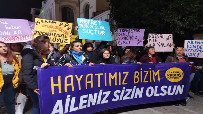 25 Kasım Kadına Yönelik Şiddete Karşı Uluslararası Mücadele Günü eylemlerinin startını Kadıköy’de veren 25 Kasım Kadın Platformu, Hayatımız bizim, aileniz sizin olsun! Diyerek Süreyya Operası’nda basın açıklaması yaptı.  Basın açıklamasını, Platform adına Rüya Kurtuluş yaptı., Erdoğan’ın “güçlü aile güçlü milletleri doğurur” propagandasına yer verilen açıklamada Kurtuluş,bütün kadınları 25 Kasım’da Taksim Tünel’e davet etti.