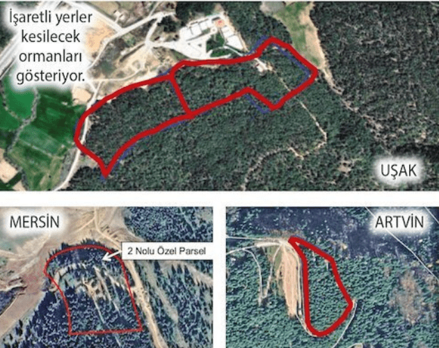 Bakanlık tarafından hazırlanan şartnamede kesilip tesis yapılacak orman alanlarının kırmızı ve mavi çizgilerle işaretlendiği uydu fotoğrafları da yer aldı.