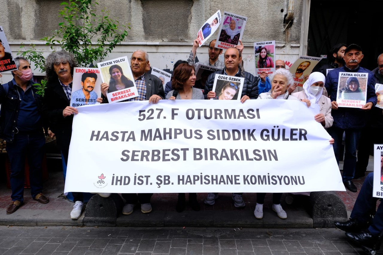 İnsan Hakları Derneği (İHD) İstanbul Şubesi Hapishaneler Komisyonu, hasta tutukluların durumuna dikkat çekmek için her hafta düzenledikleri “F Oturumu” eyleminin 527’ncisini dernek binalarının önünde gerçekleştirdi. Bu haftaki eylemde, Menemen R Tipi Hapishanesi’nde tekerlekli sandalyeye bağlı ve kendi ihtiyaçlarını tek başına gideremeyecek durumda olan 82 yaşındaki ağır hasta tutuklu Sıddık Güler’in durumuna dikkat çekildi.