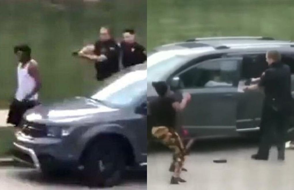 Sosyal medyada dolaşan bir video, beyaz tişörtlü ve siyah şortlu bir adamın gri bir minibüse doğru yürüdüğünü ve ardından silahları çekilmiş iki polis memurunu gösteriyor.