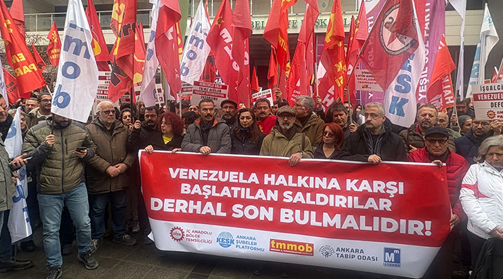 Amerika Birleşik Devletleri’nin (ABD) Venezuela’ya dönük emperyalist saldırıları ve Devlet Başkanı Nicolas Maduro ile eşi Cilia Flores’i kaçırması Ankara’da protesto edildi. Çok sayıda meslek örgütü, siyasi kurum ve demokratik kitle örgütünün katıldığı eylemde, “Venezuela halkına karşı başlatılan saldırılar derhal son bulmalıdır” pankartı açıldı.