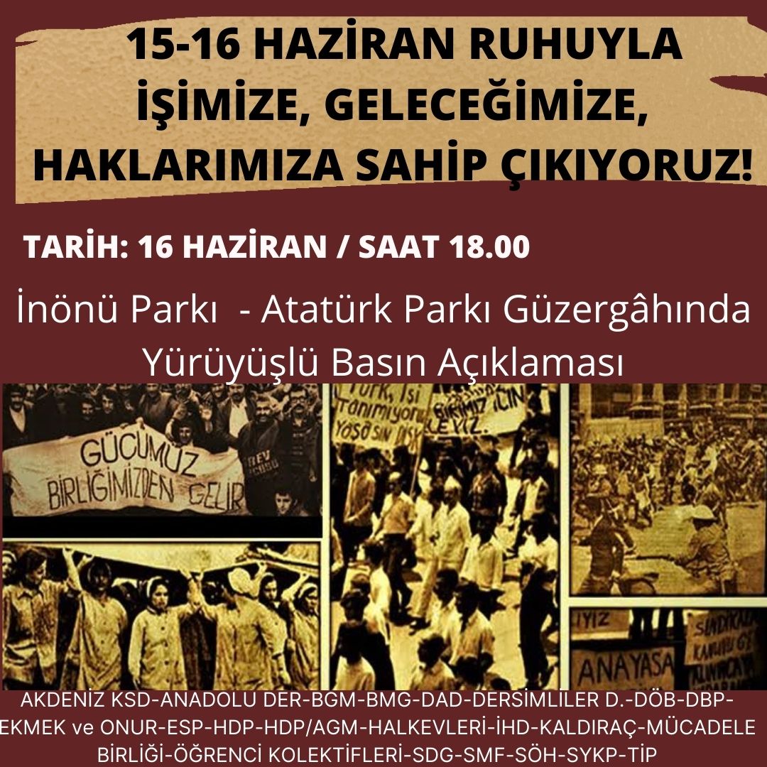 Adana’da 15-16 Haziran Büyük İşçi Direnişi’nin 51. Yıldönümünde devrimci demokrat yurtsever kurumlar “15-16 Haziran ruhuyla işimize, geleceğimize, haklarımıza sahip çıkıyoruz!” şiarıyla yürüyüş ve basın açıklaması düzenleyecek.