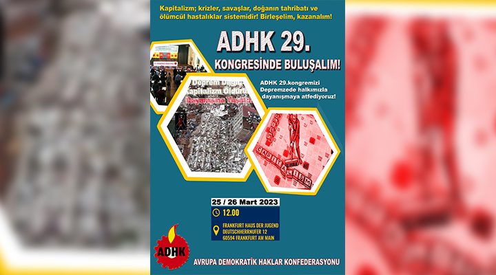 Avrupa Demokratik Haklar Konfederasyonu (ADHK) 29. Olağan Kongresini, ‘’Kapitalizm; krizler, savaşlar, doğanın tahribatı ve ölümcül hastalıklar sistemidir. Birleşelim Kazanalım’’ şiarıyla 25 – 26 Mart 2023 tarihleri arasında Frankfurt Haus der Jugend Salonunda gerçekleştirecek.