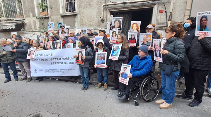 İnsan Hakları Derneği (İHD) İstanbul Şubesi Hapishane Komisyonu, her hafta düzenledikleri “F oturumunun” eyleminin 618’incisni şube binası önünde gerçekleştirdi. Bu haftaki eylemde, Antalya S Tipi Hapishanesi’nde yüzde 70 engelli raporu bulunan ağır hasta tutsak Eser Morsümbül’ün durumuna dikkat çekilerek, serbest bırakılması istendi. Açıklamayı İHD gönüllülerinden Türker Demirci okudu.