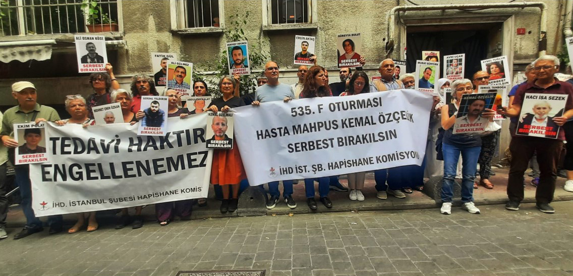 İnsan Hakları Derneği (İHD) İstanbul Şubesi Hapishaneler Komisyonu, hasta tutukluların durumuna dikkat çekmek için her hafta düzenledikleri “F Oturumu” eyleminin 535’incisini dernek binalarının önünde gerçekleştirdi. Bu haftaki eylemde, Tekirdağ 1 No’lu F tipi Hapishanesi’nde tutulan hasta tutuklu Kemal Özçelik’in sağlık durumuna dikkat çekildi. Bu haftaki açıklamayı Hatice Onaran okudu.