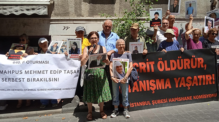 İHD İstanbul Şubesi Hapishane Komisyonu, her hafta düzenledikleri “F Oturması” eyleminin 640’ıncısını Beyoğlu’nda bulunan dernek binası önünde gerçekleştirdi.  Bu haftaki eylemde, Marmara 5 No’lu L Tipi Hapishanesi’nde bulunan 68 yaşındaki Mehmet Edip Taşar’ın sağlık durumuna dikkat çekildi.