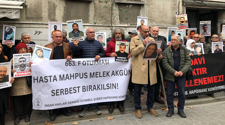 İnsan Hakları Derneği (İHD) İstanbul Şubesi Hapishane Komisyonu, her hafta düzenlediği “F Oturması” eyleminin 663’üncüsünü Beyoğlu’nda bulunan dernek binası önünde düzenledi.  Bu hafta Kayseri Bünyan Kadın Kapalı Hapishanesi’nde tutulan 58 yaşındaki yüzde 82 engelli ağır hasta tutsak Melek Akgün’ün sağlık durumu paylaşılarak serbest bırakılması çağrısı yapıldı. Eylemde “Melek Akgün serbest bırakılsın” ve “Tedavi haktır engellenemez” yazılı pankartlar açılırken hasta tutsakların fotoğraflarının olduğu dövizler taşındı. Eylemde sık sık “Tedavi haktır engellenemez”, “Tecrit öldürür dayanışma yaşatır”, “Melek Akgün serbest bırakılsın” sloganları atıldı. Basın açıklamasını Taylan Bekin okudu.
