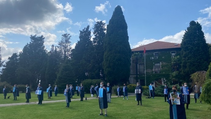 Boğaziçi Üniversitesi akademisyenlerin, “kayyım rektör” atamaları ve atanan kayyım rektörlerin meslektaşların işlerine son vermesini protesto etmek için 180’inci kez rektörlük binasına sırtını döndü. Akademisyenler ellerinde “Vazgeçmiyoruz”, “Kabul etmiyoruz” dövizlerini taşırken, derslerine son verilen Can Candan, Feyzi Erçin ve Seda Binbaşgil’in fotoğraflarını taşıdı.