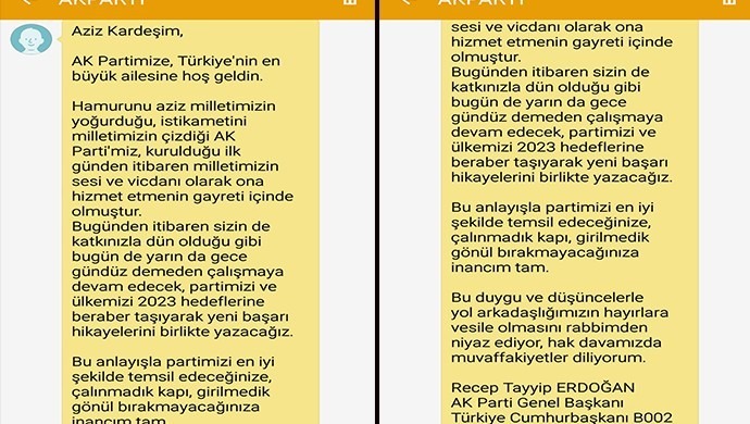 Benzer bir durumu Mersin’in Akdeniz ilçesinde Eyüp Yıldız da yaşadı. 30 yıldır kentte esnaf olan Yıldız, şimdiye kadar hiçbir siyasi partiye üye olmadığını söyledi. 24 Eylül’de AKP’ye üye olduğuna dair telefonuna mesaj geldiğini aktaran Yıldız, “Mesajın içeriğinde ‘ailemize hoş geldin’ diyor. Beni partilerine üye yapmışlar” dedi.