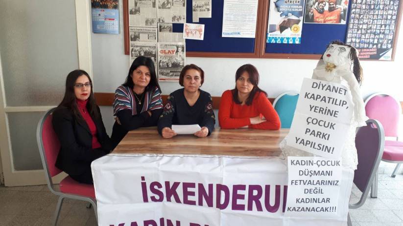 Diyanet İşleri Başkanlığı’nın açıklamalarına bir tepki de İskenderun Kadın Platformu’ndan geldi. Eğitim Sen İskenderun Şube binasında basın toplantısı düzenleyen kadınlar, AKP’nin eğitimde 4+4+4 uygulamasına geçilmesiyle birlikte çocuk yaşta evlendirilmelerin önünü açıp, çocukların eğitim hakkını gasp ettiğine dikkat çekti.