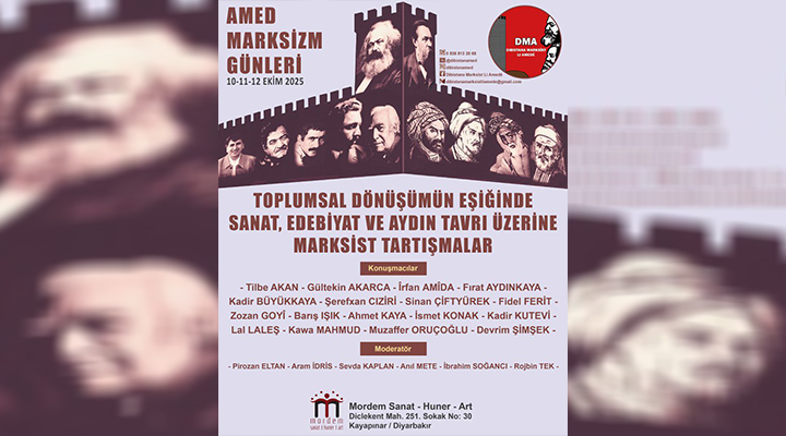 Amed Marksist Okul, “Amed’de Marksizm Günleri” ana başlığı altında her yıl Ekim ayının ikinci haftasının düzenlediği etkinlik bu yıl 10-11-12 Ekim’de gerçekleşecek. 10 Ekim’de başlayacak, 12 Ekim’e kadar devam edecek olan etkinliğin konusu “Toplumsal Dönüşümün Eşiğinde Sanat, Edebiyat ve Aydın Tavrı Üzerine Marksist Tartışmalar” olacak.