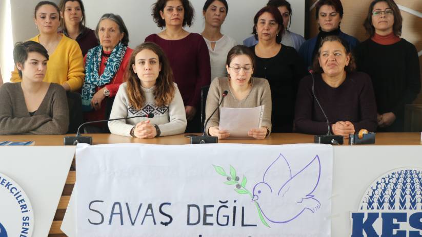 Medyada algı operasyonu yapıldığını belirten Yılmaz, “Savaş kadınlar ve çocuklar için açlık, yoksulluk, taciz, tecavüz ve ölümdür. Savaş insanlık suçudur. Savaş karşıtı olmaktan, barışı talep etmekten vazgeçmiyoruz, tüm baskılara, gözaltılara ve tutuklamalara rağmen bu suça ortak olmayacağız. Barış talebinden asla vazgeçmeyeceğiz” diye konuştu.
