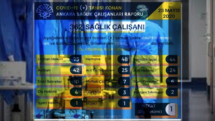 Ankara Tabip Odası (ATO) Yönetim Kurulu tarafından yapılan çalışmaya göre, 23 Mayıs itibariyle 362 sağlık emekçisinin koronavirüs (Kovid-19) testi pozitif çıktı. Konuyla ilgili sosyal medyada paylaşım yapan oda yönetim kurulu, “23 Mayıs 2020 tarihi itibariyle Ankara Tabip Odası Yönetim Kurulu tarafından ulaşılan ve teyit edilen Covid-19 (+) tanısı alan sağlık çalışanlarının sayısı 362’ye yükselmiştir” diye belirtti.