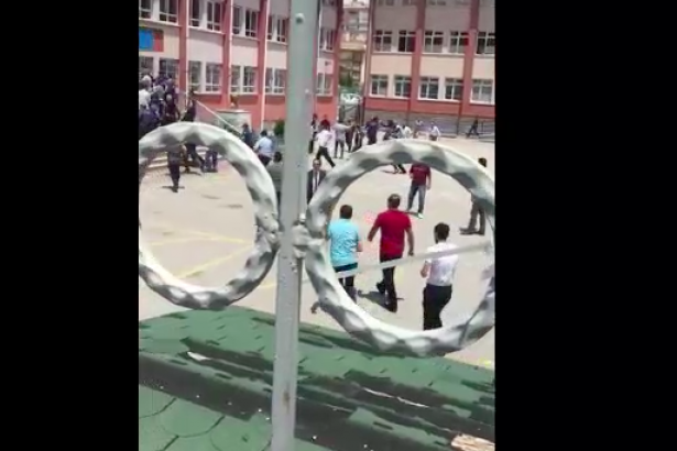 Görüntülerde, okul önünde de kavganın ve darpın sürdüğü fark edildi.