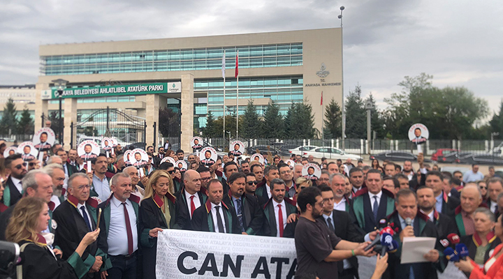 Türkiye Barolar Birliği (TBB) ve 55 barodan avukatlar, 14 Mayıs seçimlerinde Türkiye İşçi Partisi’nden (TİP) Hatay milletvekili seçilmesine ve mazbatasını almasına rağmen hapishanede tutulmaya devam eden Can Atalay için bugün Anayasa Mahkemesi (AYM) önünde bir araya geldi.