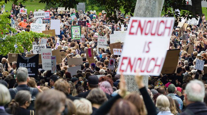 Pek çok kişinin siyah kıyafetlerle katıldığı protestolarda, geçtiğimiz on yıl içinde katledilen kadınların isimlerinin yazdığı pankartlar taşındı. Başkent Canberra’da parlamento binası önünde bir araya gelen, yüzlerce kişi “Kadınlar için adalet” ve “Erkekler suçunuzu kabul edin” yazılı pankartlarla yürüdü.