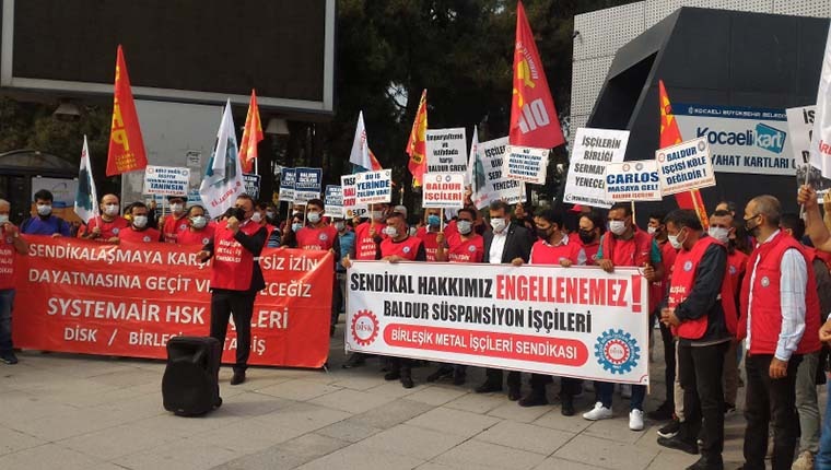 Gebze’de 180 gündür grevde olan Baldur işçileri ve sendikalaşma hakkı için direnen HSK Systemair işçilerinin direnişlerinin 247. gününde Birleşik Metal-İş Sendikası, Gebze Kent Meydanı’nda açıklama yaptı, işçiler Ankara’ya, Çalışma ve Sosyal Güvenlik Bakanlığı ile yapılacak olan görüşmeye uğurlandı.