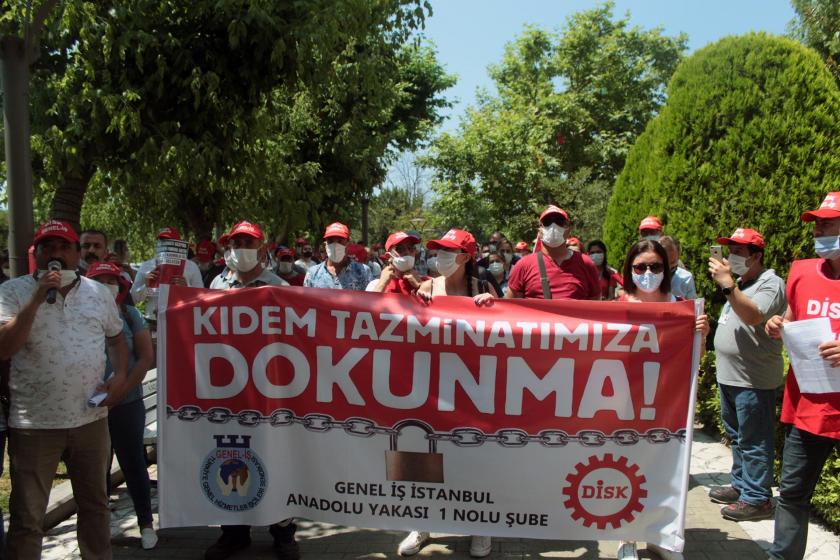 Kıdem Tazminatının Tamamlayıcı Emeklilik Sistemi (TES) adı altında fona devredilmesine karşı DİSK’e bağlı Genel İş İstanbul Anadolu Yakası 1 No’lu Şubesi Kadıköy Belediyesi önünde basın açıklaması gerçekleştirdi. “Kıdem Tazminatıma dokunma” pankartı açan sendika üyes emekçiler sık sık, “Kıdeme uzanan eller kırılsın”, “Kahrolsun işçi düşmanları”, “Kıdem hakkımız gasbedilemez”, “Kıdem hakkımız söke söke alırız” sloganı attı.