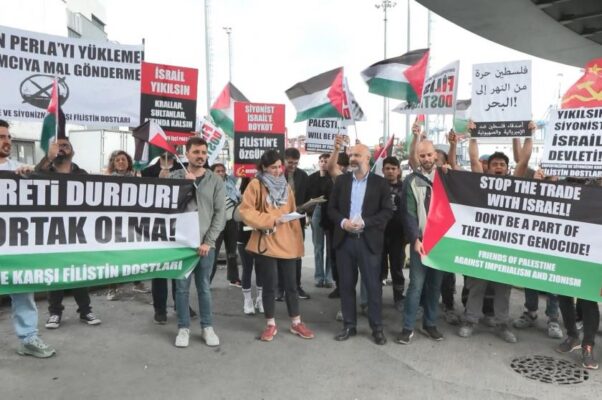 Emperyalizme ve Siyonizm’e Karşı Filistin Dostları Platformu üyeleri ile Devrimci İşçi Partisi üyeleri, Beylikdüzü’ndeki Ambarlı Limanı’ndan gemiyle İsrail’in Ashdod Limanı’na tonlarca mal götürülmesini protesto etti. Limanda toplanan grup, pankart açarak ‘İşçi Sınıfı Filistin’in Yanında’, ‘Soykırıma Değil Direnişe Ortak Ol’ ve ‘İsrail’e Boykot Filistin’e Özgürlük’ sloganları attı.