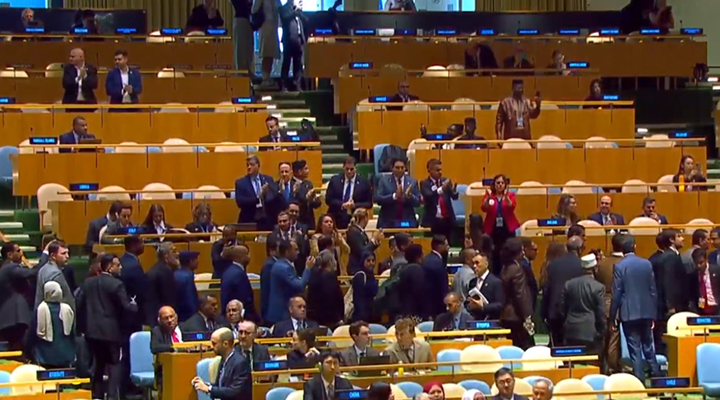 Netanyahu, BM 80. Genel Kurulu’na hitap etmek için salona girdiğinde, çok sayıda ülke temsilcisinin salonu terk etmeye başladığı ve salonun önemli ölçüde boşaldığı görüldü.