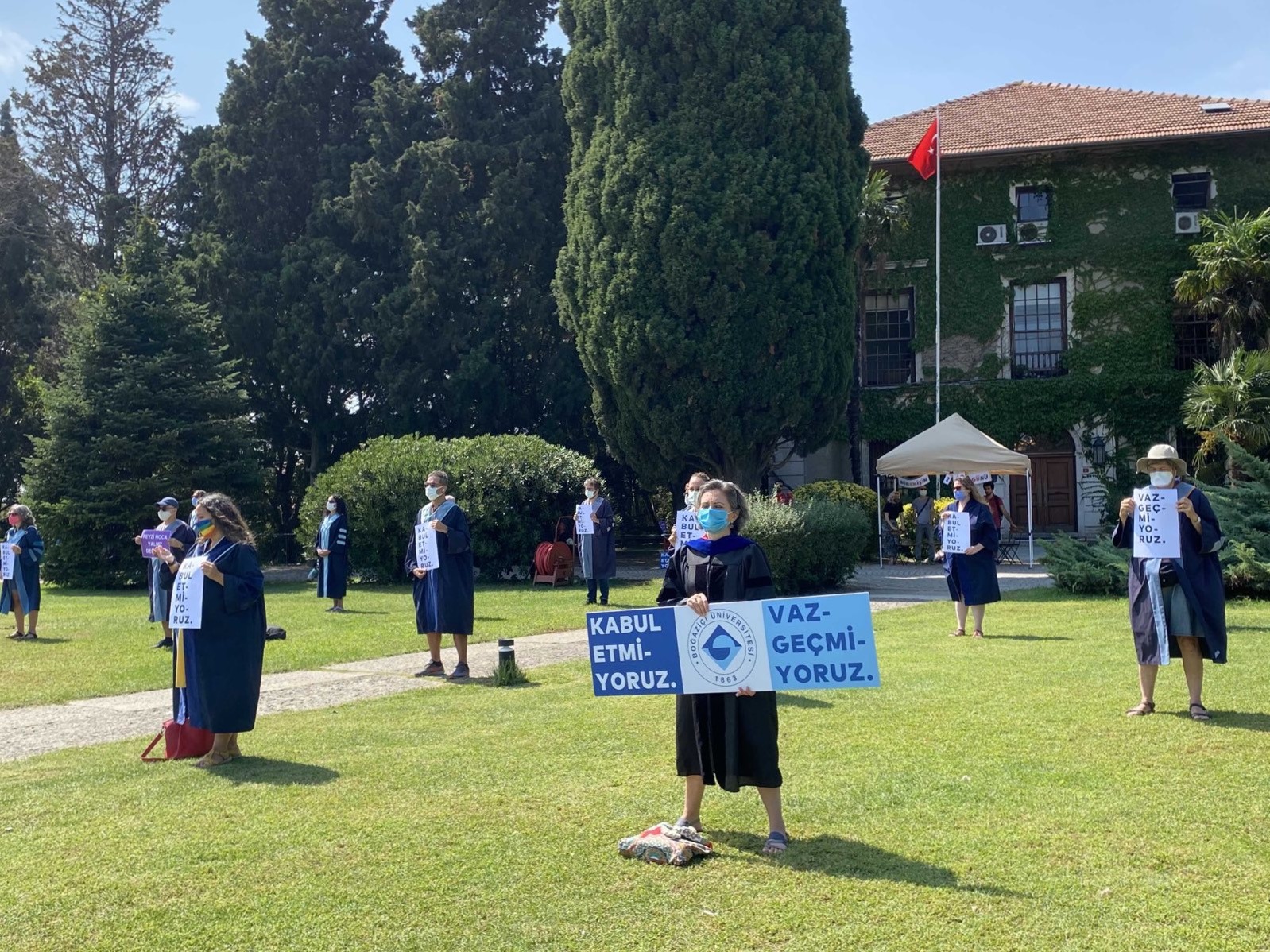 Boğaziçi Üniversitesi akademisyenleri, bugün (31 Ağustos) nöbetlerinin 159. gününde bir kez daha “Kayyumluk” binasına sırtlarını döndü. Akademisyenler nöbetlerinin 159. gününde de “Kabul etmiyoruz, vazgeçmiyoruz” dedi.