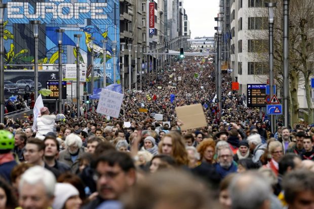 Kuzey Tren İstasyonu’nda toplanan kitle, Avrupa Birliği (AB) kurumlarının bulunduğu Schuman bölgesinden geçerek, Cinquantenaire Parkı’na doğru yürüdü.