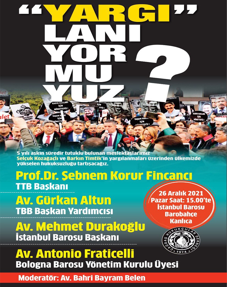 “Değerli üye ve meslektaşlarımız, Genel Başkanımız Av. Selçuk Kozağaçlı ve Av. Barkın Timtik’in 5 yılı aşkın süredir tutuklu yargılandıkları dosyanın yaklaşan duruşması öncesinde, bu dosya üzerinden de ağır şekilde tanık olduğumuz ve ülkemize yayılan hukuksuzluğun konuşulacağı etkinliğimiz 26 Aralık Pazar günü saat 15.00’te İstanbul Barosu Barobahçe’de gerçekleştirilecektir. Tüm üye ve meslektaşlarımızın, basın emekçileri ve kamuoyunun katılımını bekleriz.”