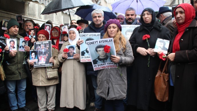 Bu haftaki açıklamayı, 21 Mart 1995’te gözaltına alınarak öldürülen ve cenazesi kimsesizler mezarlığında bulunan Hasan Ocak’ın kardeşi Maside Ocak yaptı. Savaşın acısını en iyi bilenlerin kayıp yakınları olduğunu belirten Ocak, Türkiye’nin İdlib’e dönük savaşında yaşamını yitirenlerin ailelerine sabırlar diledi. 20 Şubat 1994’te Bakırköy İncirli’de TEM polisleri tarafından gözaltına alındıktan sonra kaybedilen İstanbul Üniversitesi İktisat Fakültesi öğrencisi Cüneyt Aydınlar’ın akıbetini soran Ocak, “Cüneyt’in 27 Şubat 1994’te kaydı yapıldı ve gözaltında olduğu resmi olarak kabul edildi. Ancak Cüneyt’le gözaltında tutulan 14 kişi savcılığa çıkartıldığında aralarında Cüneyt yoktu. Bu kişiler 17 Mart 1994’te avukatları aracılığıyla kamuoyuna yaptıkları açıklamada; Cüneyt Aydınlar’ın 20 Şubat 1994’te gözaltına alındığını ve 2 Mart 1994 tarihine kadar birlikte gözaltında tutulduklarını, Cüneyt’in başına geleceklerden Gayrettepe Terörle Mücadele Şubesinin sorumlu olduğunu söylediler. Cüneyt’e ağır işkence yapıldığına, yürüyemez ve hareket edemez halde olduğuna dair çok sayıda tanık vardı. Ancak İstanbul Emniyet Müdürlüğü, onu soran ailesine oğullarının 28 Şubat 1994’te yer göstermek için götürdükleri Beyoğlu Çukurcuma’da ‘Dur’ ihtarına uymayarak kaçtığını söyledi. Ailenin başvurusu üzerine İHD avukatları olayı araştırdı, tanıklarla görüştü. Yapılan araştırma sonrasında, İHD İstanbul Şubesi, 25 Mart 1994 tarihli basın açıklaması ile İstanbul Emniyet Müdürlüğü Terörle Mücadele Şubesinin gözaltına aldığını kabul ettiği Cüneyt Aydınlar’ı kaybettiğini duyurdu” diye konuştu.