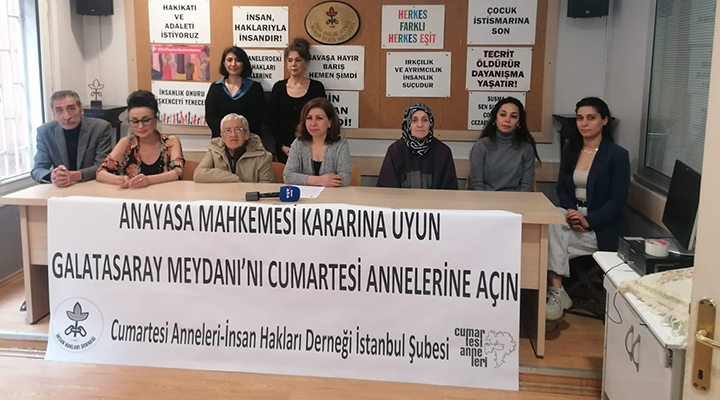 Cumartesi Anneleri, Anayasa Mahkemesi’nin (AYM) Galatasaray Meydanı’nın yasaklanmasına dair “hak ihlali” kararı vermesinin ardından 8 Nisan tarihinde Galatasaray Meydanı’nda yapmak istedikleri eylemdeki polis saldırısına ilişkin İstanbul Cumhuriyet Başsavcılığı’na suç duyurusunda bulunarak İnsan Hakları Derneği (İHD) İstanbul Şube binasında basın toplantısı gerçekleştirdi. İHD Eş Genel Başkanı Eren Keskin, İHD İstanbul Şube Başkanı Gülseren Yoleri ve Cumartesi Anneleri/insanları ve avukatların katıldı. Açıklamayı kitle adına İHD İstanbul Şube Başkanı Gülseren Yoleri okudu.
