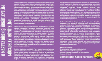 / 4 yıl agoDemokratik Kadın Hareketi’nden 8 Mart açıklaması: ‘8 Mart’ta Direnişi Örgütleyelim Mücadeleyi Büyütelim’