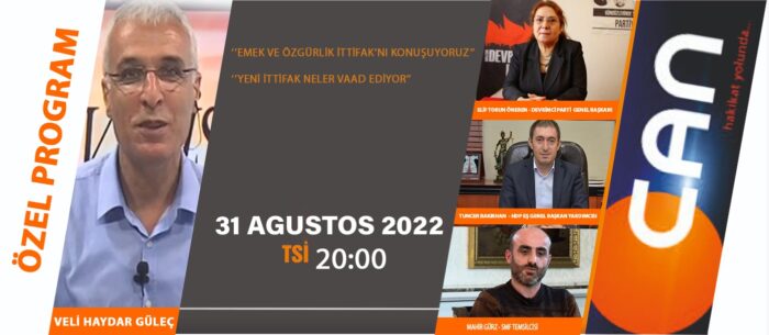 Veli Haydar Güleç’in hazırladığı “Emek ve Özgürlük İttifakı neler vaad ediyor?” adlı özel program bu akşam TS ile 20.00’de Can TV'de.