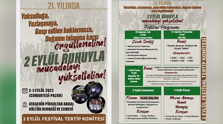 1 Mayıs Mahallesi 2 Eylül festivali bu yıl “Yoksulluğa, Yozlaşmaya, Gasp Edilen Haklarımıza, Doğanın Talanına Karşı Örgütlenelim! 2 Eylül Ruhuyla Mücadeleyi...