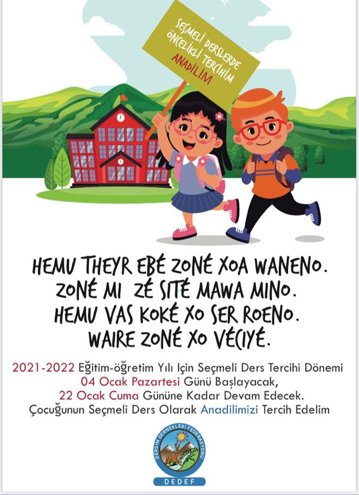 DEDEF’ten çağrı: 2021-2022 Eğitim-Öğretim yılında Zazaki/Kırmancki seçmeli dersini seçin, eğitim kurumları gerekli koşulları yaratmak zorunda!
