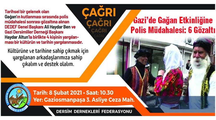 Yapılan çağrıda, “Tarihsel gelenek olan Gağan’ın kutlanması sırasında polis müdahalesi sonrası gözaltına alınan DEDEF Genel Başkanı, Ali Haydar Ben ve Gazi Dersimliler Derneği Başkanı Haydar Altun’la birlikte 4 kişinin yargılanması bir kültürün ve tarihin yargılanmasıdır. Kültürüne ve tarihine sahip çıkmak için yargılanan arkadaşlarımıza sahip çıkalım ve destek olalım” ifadelerine yer verildi.