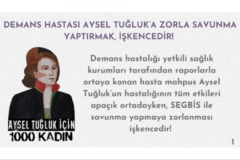 Aysel Tuğluk için 1000 Kadın yaptığı açıklamada duruşma sırasında konuşmakta ve kendisini ifade etmekte zorlanan demans hastası Aysel Tuğluk’un mahkeme başkanının “Savunmanız nedir savunmanıza başlayın” şeklindeki ısrarına karşı “Benim özel bir durumum var. Hasta olduğum için kendimi ifade edemiyorum. Bu hastalıktan dolayı savunmamı daha sonra yapacağım” demek zorunda kaldığını anımsattı.