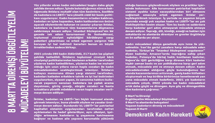 Demokratik Kadın Hareketi ‘de yazılı bir açıklama yaparak başta emekçi kadınlar olmak üzere tüm kadınları 8 Mart’ta sokaklara çıkmaya çağırdı.