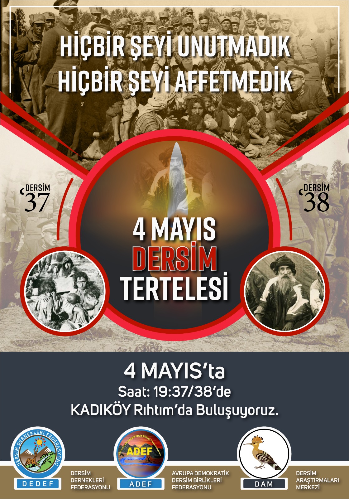 Dersim Dernekleri Federasyonu (DEDEF) ve Avrupa Dersim Dernekleri Federasyonu (ADEF), Dersim Araştırmalar Merkezi (DAM), yaptıkları ortak açıklama ile Dersim 37-38 anmasına çağrı yaptılar. “Coğrafyamızda yaşanan katliamların bilinmesini, tarihimizin, kültürümüzün, dilimizin ve inancımızın yaşamasını ve yaşatılmasını görünür kılmak istiyoruz” denilen açıklamada, katliamda yitirilenleri anma için 4 Mayıs Çarşamba günü, Saat 19.38’de, Kadıköy Rıhtım’a çağrı yapıldı.