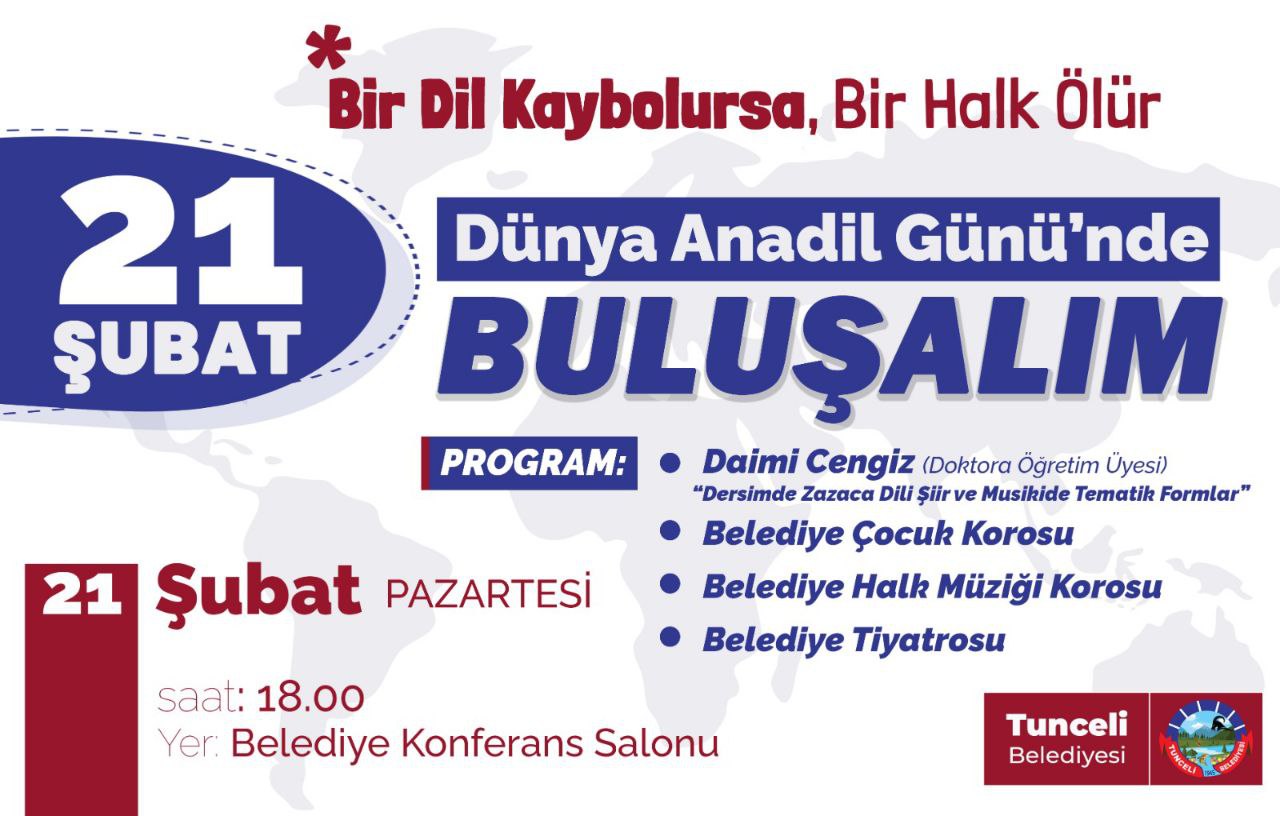 17 Kasım 1999 tarihinde UNESCO, 21 Şubat’ı Uluslararası Anadil Günü olarak ilan etmiş ve 2000 yılından bu yana karar altına alınan ve kutlanan “Dünya Anadil Günü ” vesilesiyle Dersim Belediyesi bir etkinlik düzenleyecek.