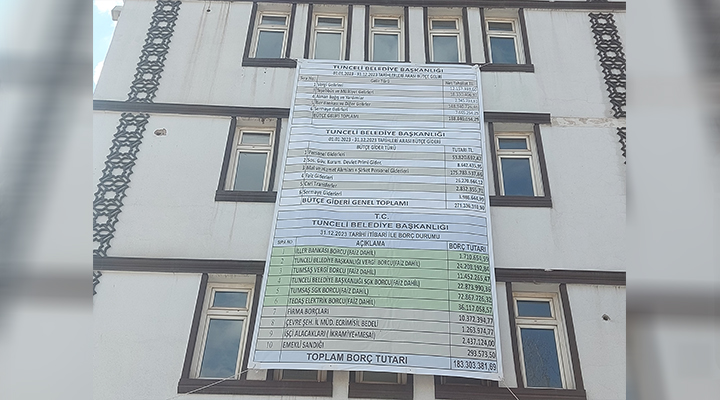 Dersim Belediyesi, şeffaf belediyecilik kapsamında 1 Ocak 2023 ile 1 Aralık 2023 tarihleri arasında belediyeye ait gelir-gider tablosunu belediye binasına astı.