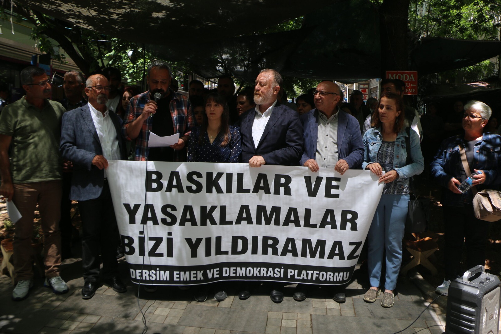 Açıklamada, ‘Baskılar ve yasaklamalar bizi yıldıramaz’ pankartı açıldı. Basın açıklamasına HDP milletvekilleri Alican Önlü, Dersim Dağ ve Sezai Temelli de katıldı. Basın açıklamasını platform adına EMEP Dersim İl Başkanı Ergin Tekin okudu.