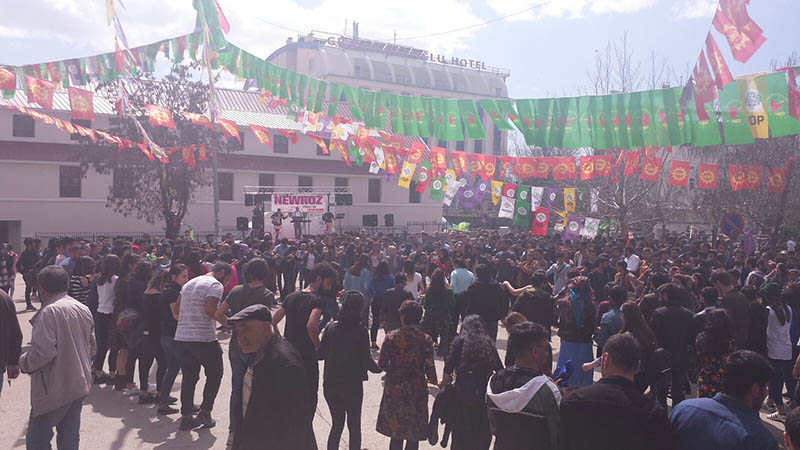 Saat 11.00’den itibaren meydanda toplanan kitle, davul ve zurna eşliğinde Newroz ateşini yakarak, halaylara başladı.