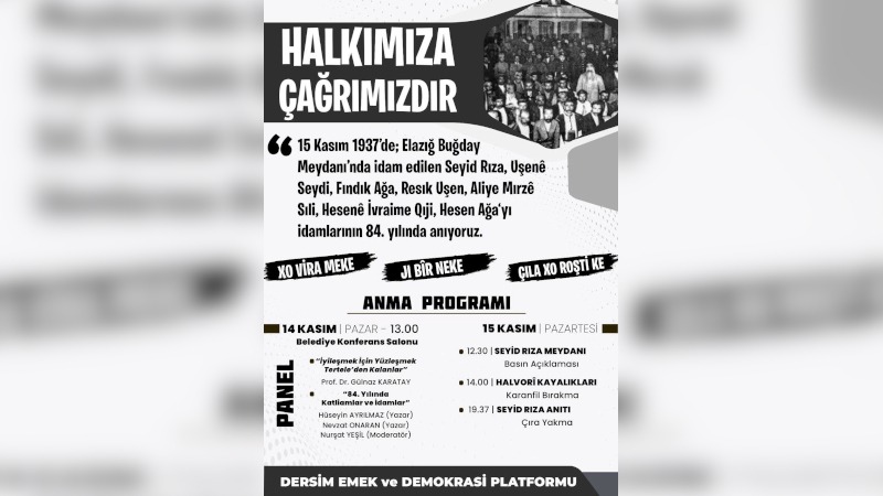 15 Kasım 1937 tarihinde Seyit Rıza, Uşenê Seydi, Fındık Ağa, Resık Uşen (Seyit Rıza’nın oğlu), Aliye Mırzê Sıli, Hesenê İvraime Qıji ve Hesen Ağa’nın Elazığ Buğday Meydanı’nda idam edilmelerinin üzerinden 84 yıl geçti. Anmaya çağrı bildirisi dağıtan Dersim Emek ve Demokrasi Platformu üyeleri hakkında soruşturma başlatıldı.