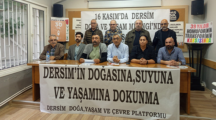 Dersim Doğa, Yaşam ve Çevre Platformu, iktidar ve sermayenin doğayı, suyu ve yaşam alanlarını tehdit eden rant ve talan projelerine karşı 16 Kasım Pazar günü saat 12.00’de Dersim Seyit Rıza Meydanı’nda “Doğa ve Yaşam Mitingi” düzenleyecek. Dersim Doğa, Yaşam ve Çevre Platformu, 16 Kasım’da yapılacak olan miting öncesinde İnsan Hakları Derneği (İHD) İstanbul Şubesi’nde basın açıklaması yaptı. “16 Kasım’da Dersim Doğa ve Yaşam Mitingi’nde buluşalım” ve “Dersim’in doğasına, suyuna ve yaşamına dokunma” pankartı asıldı. Basın açıklamasına, Sosyalist Meclisler Federasyonu (SMF) Dönem Sözcüsü Mahir Gürz ve SMF Ekoloji Meclisi, DEM Parti İstanbul İl Eş Başkanı Çınar Altan, İHD üyeleri, Doğa İçin Sanat Derneği ve İklim Adaleti Koalisyonu katıldı. Dersim Dernekleri Federasyonu ekolojiden Sorumlu Genel Başkan Yardımcısı Ulaş Yeğin basın metnini okudu.