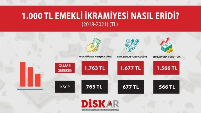 Raporda, artan fiyatlar karşısında da emekli bayram ikramiyesinin alım gücünün düştüğüne dikkat çekilerek, “Mart 2018 ve 2021 arasındaki üç yıllık dönemde TÜFE (Tüketici Fiyat Endeksi) yüzde 56 oranında arttı. Buna karşılık emekli bayram ikramiyelerinde herhangi bir artış yaşanmadı. Böylece emekli bayram ikramiyesi enflasyon karşısında yüzde 56 eridi. Emekli ikramiyesi üç yılda enflasyona göre artırılsaydı, en az bin 556 TL olması gerekirdi. Böylece emekli ikramiyesinin enflasyon karşısındaki kaybı bir yılda bin 286 TL olarak gerçekleşti” tespiti yapıldı.