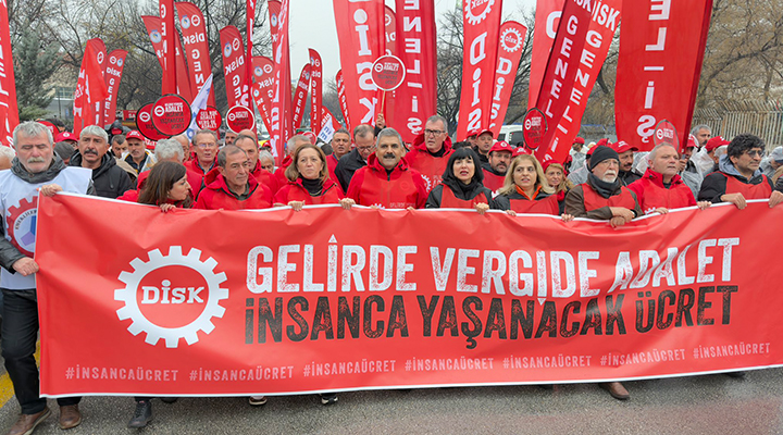 DİSK Genel Başkanı Arzu Çerkezoğlu, “Talebimiz net; vergi ve gelirde adalet, insanca yaşam için ücret istiyoruz. Bu ülkede üretiyoruz ama hakça paylaşamıyoruz. Düzenin bütün çarkları zengini daha zengin yapmak için dönüyor” dedi. Türkiye’de servet dağılımındaki uçuruma dikkat çeken Çerkezoğlu, nüfusun yarısının toplam servetin yalnızca yüzde 2.8’ini aldığını, en zengin yüzde 1’lik kesimin ise servetin yüzde 35’ine sahip olduğunu belirtti. En zengin yüzde 10’un toplam servetin yüzde 70’ini aldığına işaret eden Çerkezoğlu, “Böyle bir haksızlık kabul edilemez” dedi.