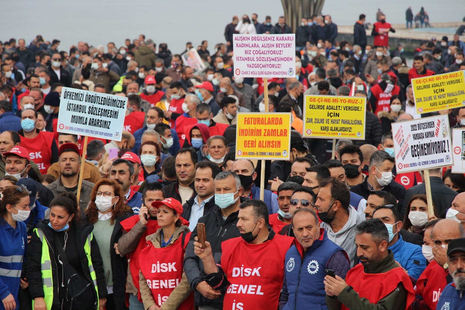 Devrimci İşçi Sendikaları Konfederasyonu (DİSK) Ege Bölge Temsilciliği, ülkede emekçilerin yaşadığı ekonomik sıkıntılara ilişkin “Geçinemiyoruz” sloganıyla Cumhuriyet Meydanı’nda kitlesel basın açıklaması düzenledi. Çok sayıda emekçinin yanı sıra çeşitli siyasi parti ve sivil toplum kuruluşları temsilcilerinin de katıldığı açıklamada, “Geçinmek istiyoruz, gelirde adalet, vergide adalet” yazılı pankartlar taşınarak, sık sık “Birleşe birleşe kazanacağız”, “Sarayın kölesi olmayacağız” ve “Bu daha başlangıç mücadeleye devam” sloganları atıldı.