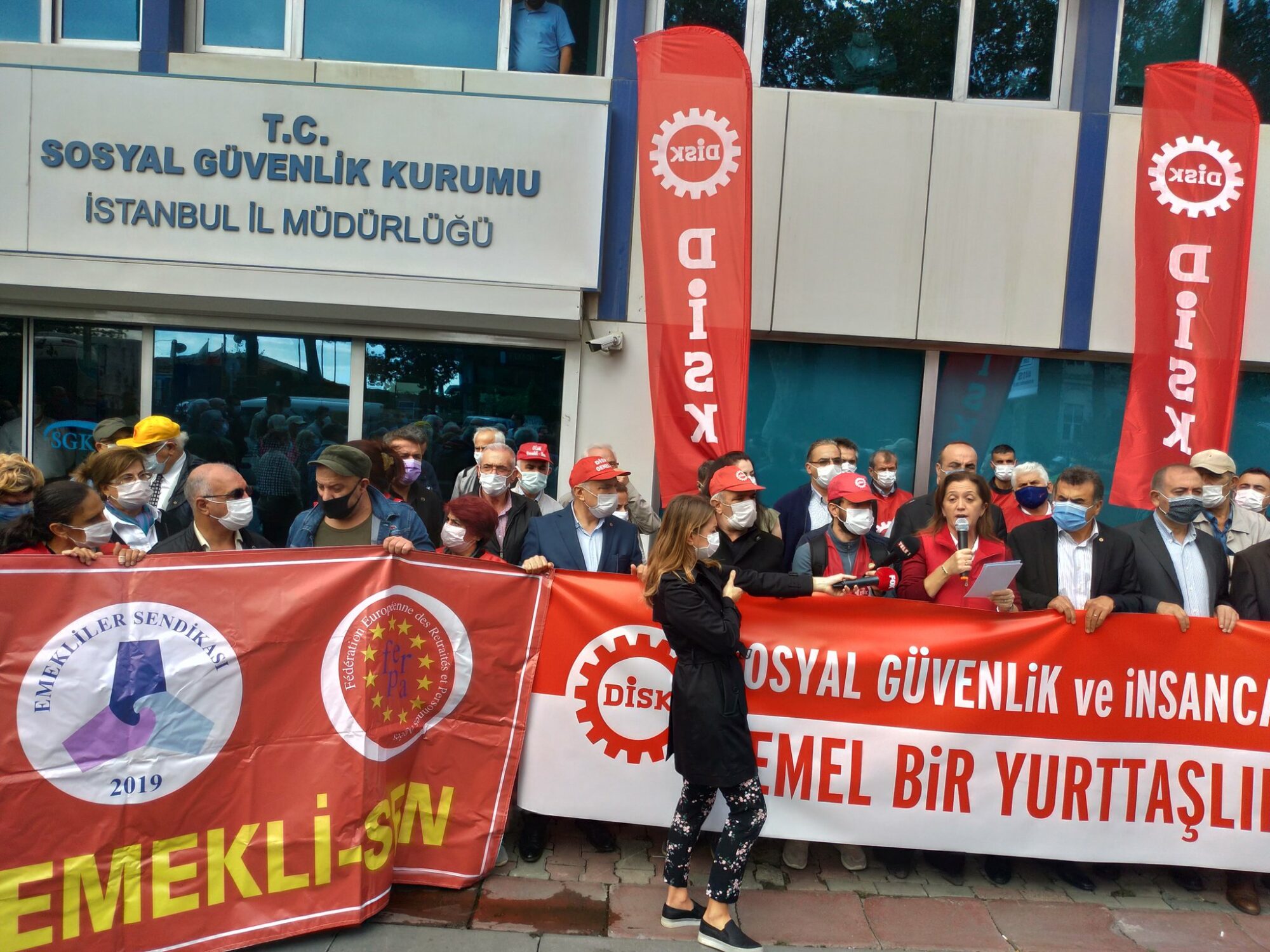 Devrimci İşçi Sendikaları Konfederasyonu Araştırma Merkezi (DİSK-AR), hazırladığı “Türkiye’de Emeklilerin Durumu ve EYT Gerçeği” başlıklı raporunu İstanbul Sosyal Güvenlik Kurumu (SGK) İl Müdürlüğü önünde gerçekleştirdiği açıklama ile duyurdu